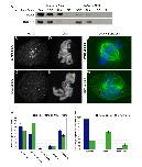 Figure 2. Fixed analysis of P-MCAK knockdown by RNAi shows defects in spindle assembly and a mitotic delay in prometaphase. PtK2 cells were transfected with a 21 bp siRNA specific to P-MCAK and then processed after 72 hrs for immunofluorescence and for immunoblotting. (A) Immunoblot of serial dilutions of either control or MCAK RNAi cell extracts. K indicates the number of cells in thousands loaded in that lane. (B, C, D, E) Immunofluorescence images of control or MCAK RNAi cells show loss of MCAK staining at centromeres. (F-G) Immunofluorescence images of control or MCAK RNAi cells that show an increase in microtubule (green) density during prometaphase as well as an increase in chromosomes (blue) lingering near the poles (arrows) when MCAK levels are knocked down. (H, I) Quantification of mitotic defects caused by MCAK RNAi. At 72 hrs post-transfection, cells were quantified to determine the specificity of defects seen. (H) Knockdown of MCAK causes a prometaphase delay in mitosis. (I) Knockdown of MCAK causes an increase in cells with increased microtubule density. All data represent mean +/- SEM for 6 experiments. N = 600 cells for mitotic index and N = 100 cells for mitotic phenotype counts for each experiment. Scale bar, 10 μm.