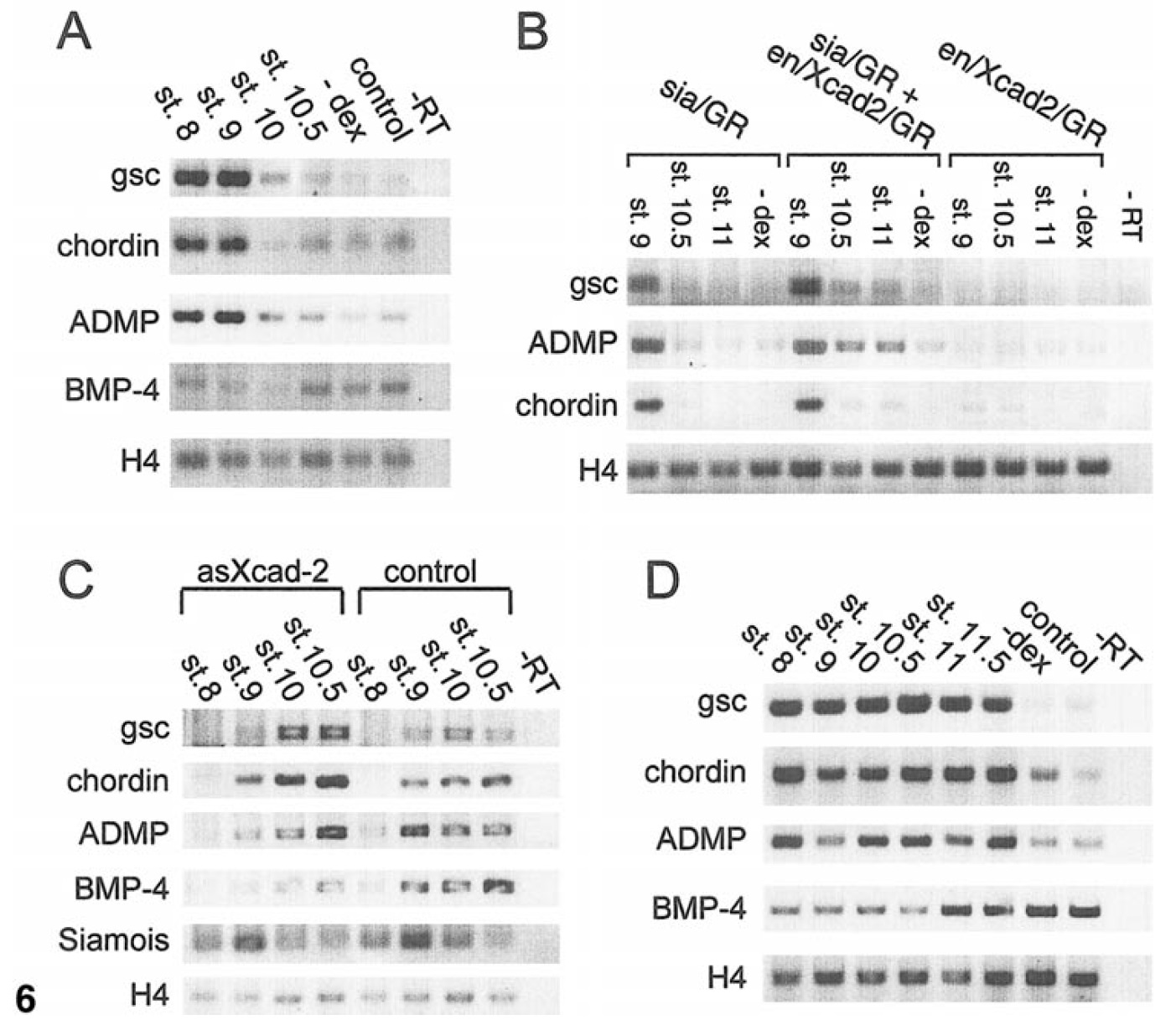 Reduction of Xcad2 function allows siamois to activate organizer-specific genes during gastrulation. Sia/GR and Xcad2 antisense RNAs were