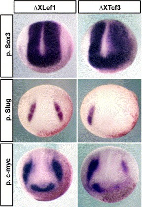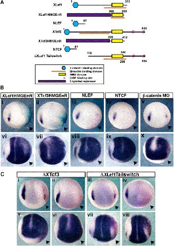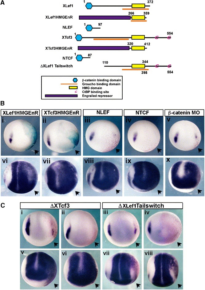 Fig. 6. Inhibition of Canonical Wnt signals induces neural tissue. (A) Schematic showing the XLef1 and XTcf3 constructs utilized in these experiments compared to full-length coding regions. (B) Embryos were injected in one blastomere at the two-cell stage with mRNA encoding constitutively repressing forms of XLef1 or XTcf3 (XLef1HMGEnR i, vi; XTcf3HMGEnR, ii, vii); the β-catenin binding domain of XLef1 or XTcf3 (NLEF, iii, viii; NTCF, iv, ix); or were injected in one blastomere at the eight-cell stage with morpholinos targeting β-catenin (v, x). For all means of inhibiting canonical Wnt signals, expression of the neural crest marker Slug was inhibited (i) and expression of the pan-neuronal marker Sox3 was dramatically expanded (vi). (C) When expressed at the same level, δXTcf3 and δXLef1 Tailswitch have equivalent ability to inhibit Slug (iv). However, δXTcf3 expands Sox3 expression (iii, iv) more potently than δXLef1 Tailswitch (vii, viii).