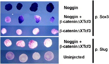 Supplemental Fig. 2. Embryos were injected with mRNA encoding Noggin, β-cateninδXTcf3 or both along with the lineage trace β-gal into two cells at the two-cell stage. Explants were cultured to stage 15 and probed for either Sox3 or Slug. Note that the level of β-cateninδXTcf3 that can inhibit Sox3 in ectodermal explants does not induce Slug when coinjected with Noggin.