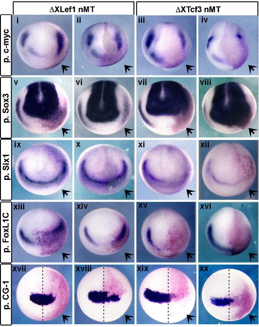Fig. 3. δXTcf3 inhibits placode and anterior neural plate border markers. Embryos injected with mRNA encoding δXLef1 or δXTcf3 and the lineage tracer β-gal were examined by in situ hybridization (Stage 14) for cement gland and placodal markers with .denoting probe used. Inhibition of c-myc expression in δXLef1- and δXTcf3-injected embryos is not restricted to the neural crest forming regions; expression in the anterior/transverse neural fold is also inhibited (iv). The placodal component of the Sox3 expression domain is inhibited by δXLef1 (v, vi) and δXTcf3 (vii, viii). Six1 expression was largely unaffected by δXLef1 (ix, x), while FoxL1C expression was shifted more posterior in some (xii) but not all (xiv) δXLef1-injected embryos. δXTcf3 inhibited both Six1 (xi, xii) and FoxL1C (xv, xvi) expression. Both δXLef1 and δXTcf3 inhibited the cement gland marker, CG-1 (xviix), although δXTcf3 did so more potently. Arrow indicates injected side. Red stain is lineage tracer β-gal.