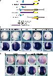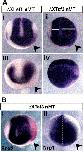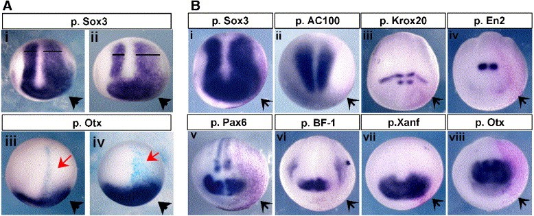 Fig. 4. δXTcf3-mediated expansion of the neural plate can be uncoupled from effects on A patterning. (A) Embryos injected into one cell at the eight-cell stage with mRNA encoding δXTcf3 show expanded expression of Sox3 along the entire A axis (i, ii). However, sibling embryos show little or no expansion of Otx expression (iii, iv); note the lineage tracer, β-gal (light blue stain) along the entire A axis and highlighted by red arrow. (B) At doses of δXTcf3 RNA that expand Sox3 (i), the mesoderm marker Muscle Actin (ii) appears relatively unaffected on the injected side (arrow). A neural markers show normal expression on the injected side (arrow) relative to contralateral control. Markers examined are (iii) Krox20; (iv) En-2; (v) Pax6; (vi) BF-1: (vii) Xanf (viii) Otx with "p." denoting probe used.