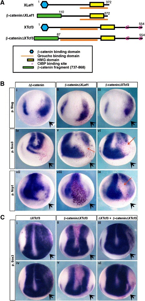 Fig. 7. Activation of Wnt/β-catenin signals inhibits neuronal precursor formation. (A) Schematic showing the XLef1 and XTcf3 constructs utilized in these experiments. (B) Upregulation of canonical Wnt signals via expression of δβ-catenin (i, iv, vii) or constitutively activating forms of XLef1 or XTcf3 (β-cateninδXLef1, ii, v, viii; β-cateninδXTcf3, iii, vi, ix) expands expression of the neural crest marker Slug (iii) and inhibits expression of the pan-neural markers Sox3 (ivi) and Nrp1 (viiix). The red arrow in panels v, vi, and ix point to cleared patches of staining where the Wnt pathway is ectopically activated. (C) The inhibition of Sox3 by β-cateninδXTcf3 (ii, v) can be rescued by coexpression of δXTcf3 (iii, vi).