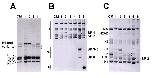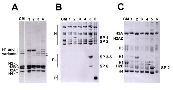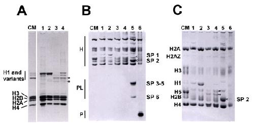 Figure 1. Electrophoretic characterization of R. catesbeiana, X. laevis and B. marinus SNPBs. Characterization of histones and SNBPs extracted from different tissues by: A) SDS-PAGE; B) AUT-PAGE run for a short time duration to separate histones (H), protamine-like proteins (PL) and protamines (P); and C) AUT-PAGE run for a longer duration to separate histones. Lane 1: R. catesbeiana liver; lane 2: R. catesbeiana blood; lane 3: R. catesbeiana sperm; lane 4: R. catesbeiana testes; lane 5: X. laevis testes; lane 6: B. marinus testes. CM; Chicken erythrocyte histones used as a histone marker. The SNBPs of X. laevis in lane 5, called sperm-specific proteins (SP1-6), are labeled and arrows (<) are used when needed to clearly indicate which bands the labels refer to. The asterisks point to the sperm-specific histone H1 complement in R. catesbeiana.