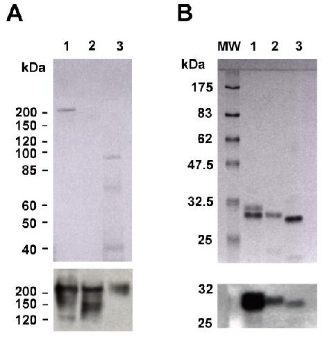 Figure 2. Western blot analysis of egg extracts and purified nucleoplasmin proteins. A) SDS-PAGE of heat soluble egg extracts from: Lane1, X.laevis; lane 2, B. marinus; lane 3, R. catesbeiana. Egg extract aliquots were mixed with an equal volume of 2 × SDS sample buffer and loaded in the gel without any previous boiling. Under these conditions the nucleoplasmin protein retains its pentameric conformatiom [25]. Molecular weights are a PageRuler Protein Ladder (Fermentas Life Sciences, Burlington, ON) B) SDS-PAGE of nucleoplasmin proteins purified from the extracts of: Lane1, X. laevis; lane 2, B. marinus; lane 3, R. catesbeiana. Samples were boiled in SDS (0.1%) sample buffer for 10 minutes before loading on the gel to separated nucleoplasmin proteins into their monomeric forms. MW is a prestained broad range molecular weight protein marker (New England Biolabs, Ipswich, MA). Western blot analysis was done using a polyclonal antibody elicited against recombinant X. laevis nucleoplasmin [28] and the results are shown in the lower panels of both A) and B) below the corresponding gels.