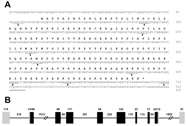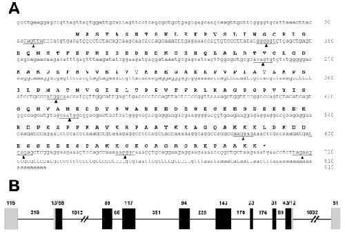 Figure 3. X. tropicalis nucleoplasmin gene. A) Nucleotide sequence and corresponding protein sequence of a nucleoplasmin cDNA from X. tropicalis [GenBank: NM_001016938]. The arrow heads and lines indicate the sites of insertion of the different introns. B) Schematic representation of the organization and structure of the gene. Exons are schematically represented by solid boxes, with black representing translated regions and grey representing untranslated regions. Introns are indicated by black lines. The numbers indicate the basepair size of the regions below them.