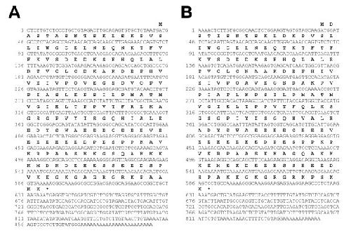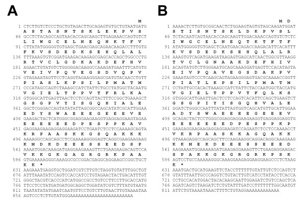 Figure 4. Coding nucleotide sequences of B. marinus and R. catesbeiana nucleoplasmin. The nucleotide sequences determined in this study and translated protein sequences of nucleoplasmin cDNAs from A) B. marinus [GenBank: DQ340657] and B) R. catesbeiana [GenBank:DQ340656] are shown.