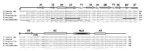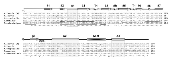 Figure 5. Protein sequence alignment of amphibian nucleoplasmins. The primary structures of nucleoplasmin from X. laevis (A) [60] [GenBank: X04766], X. laevis (Burglin et al., 1987) [GenBank: CAA68363], X. tropicalis [GenBank: NP_001016938], B. marinus and R. catesbeiana are shown. Identical amino acids are denoted by an asterisk, highly similar residues by a colon, and less similar residues by a period, as determined by CLUSTAL W software. The partial protein sequences of B. marinus and R. catesbeiana determined by mass spectroscopy peptide sequencing are underlined. The highly structured N-terminal protein core spans amino acids 1–120 and has β sheets (β1–8), two type 1 turns (T1) and a β hairpin (βh) [8]. The other boxes represent the A1, A2, A3 polyglutamic tracts and the bipartite nuclear localization signal (NLS), as indicated.