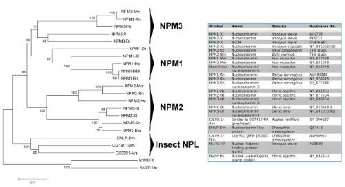 Figure 6. Phylogenetic tree of nucleophosmin/nucleoplasmin family members from various metazoans. Amino acid sequences were aligned with CLUSTAL W (Thompson et al., 1994), and the tree was produced with MEGA 3.1 (Kumar et al., 2004) using the neighbor-joining method. Two other histone-binding proteins, NASP [61] and N1/N2 [62], which are closely related to each other [61] but unrelated to the nucleophosmin/nucleoplasmin family were used to root the tree. Bootstrap significance values are shown at the corresponding internal nodes after 1000 replications.
