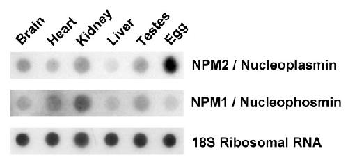 RESULTS: In this work, the presence of nucleoplasmin in oocyte extracts from these three organisms has been assessed using Western Blotting. We have used mass spectrometry and cloning techniques to characterize the full-length cDNA sequences of Rana catesbeiana and Bufo marinus nucleoplasmin. Northern dot blot analysis shows that nucleoplasmin is mainly transcribed in the egg of the former species. Phylogenetic analysis of nucleoplasmin family members from various metazoans suggests that amphibian nucleoplasmins group closely with mammalian NPM2 proteins.
