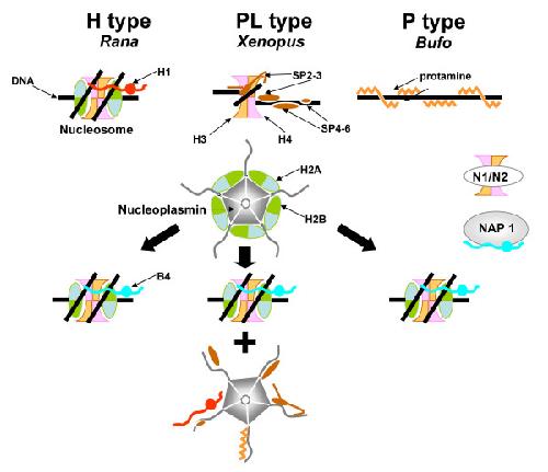 BACKGROUND: Nucleoplasmin is a nuclear chaperone protein that has been shown to participate in the remodeling of sperm chromatin immediately after fertilization by displacing highly specialized sperm nuclear basic proteins (SNBPs), such as protamine (P type) and protamine-like (PL type) proteins, from the sperm chromatin and by the transfer of histone H2A-H2B. The presence of SNBPs of the histone type (H type) in some organisms (very similar to the histones found in somatic tissues) raises uncertainty about the need for a nucleoplasmin-mediated removal process in such cases and poses a very interesting question regarding the appearance and further differentiation of the sperm chromatin remodeling function of nucleoplasmin and the implicit relationship with SNBP diversity The amphibians represent an unique opportunity to address this issue as they contain genera with SNBPs representative of each of the three main types: Rana (H type); Xenopus (PL type) and Bufo (P type).
