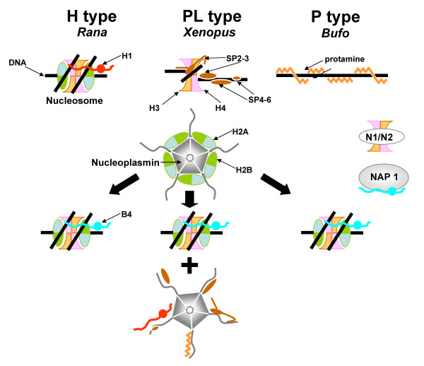 Figure 8. Schematic representation of the amphibian sperm chromatin remodeling by nucleoplasmin. The chromatin structures corresponding to each of the different SNBP types is schematically shown in the upper part of the figure. Upon fertilization of the egg, nucleoplasmin (shown here as a pentamer) stereo-specifically bound to histone H2A-H2B dimers exchanges these dimers with the SNBP components that become non-specifically (electrostatically) bound to the polyglutamic tracts of the unstructured C-terminal tails of the molecule. Note that only chromosomal proteins associated with the linker-like (non-helically constrained) domains of the sperm chromatin are extracted by nucleoplasmin which is highly phosphorylated at this stage of development [39]. Other nuclear chaperones are likely involved in the transition from the sperm chromatin to the male pronuclear chromatin. In this regard N1/N2 would be responsible for the assembly of H3/H4 [6] and NAP-1 for the assembly of egg/early embryo-specific histone B4 like histone H1 molecules [45].