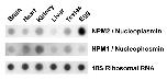 Figure 7. Northern dot blot hybridizations comparing Npm2 and Npm1 mRNA levels in different R. catesbeiana tissues. In the top two rows 7.5 μg of total RNA was loaded per well and the blot was probed with P32 labeled X. laevis Npm1 or R. catesbeiana Npm2 cDNA amplified from PCR. In the bottom row 1.5 μg of total RNA was loaded per well and the blot was probed with a P32 labeled 18S ribosome cDNA probe which was used as a loading control.