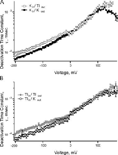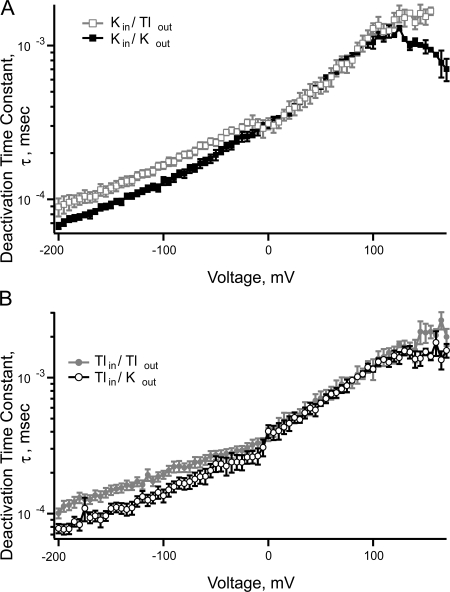 Figure 2. Deactivation rates shift at the reversal potential under biionic conditions. (A) Deactivation rates from data collected in symmetrical potassium (solid black squares) or internal potassium with external thallium (open gray squares). (B) Deactivation rates from data collected in symmetrical thallium (solid gray circles) or internal thallium with external potassium (open black circles). Each data point is the mean ± SEM. For symmetrical potassium, n = 19, symmetrical thallium, n = 17, internal thallium with external potassium, n = 15, internal potassium with external thallium, n = 13. Zero internal calcium.