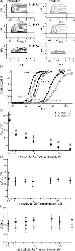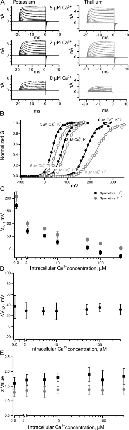 Figure 6. Calcium activation of BK channels in symmetrical potassium and thallium solutions. (A) Two patches with either symmetrical potassium (black) or symmetrical thallium (gray) at three different calcium concentrations. (B) Averages of GV curves from multiple voltage families from the patch shown in A. (C) Plot of V1/2 from Boltzmann fits at multiple calcium concentrations for symmetrical potassium solutions (black squares) and symmetrical thallium solutions (gray circles). (D) The difference in the V1/2 at each calcium concentration for symmetrical thallium and potassium. (E) The z values from Boltzmann fits of GV curves from patches with external potassium (black squares) or external thallium (gray circles).