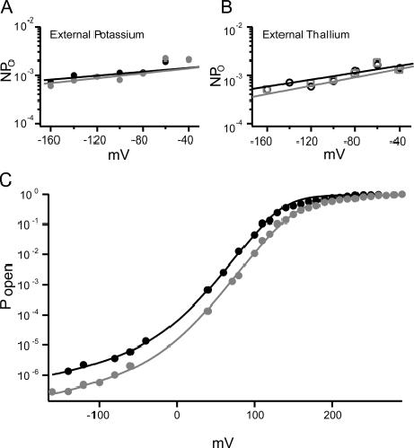 Figure 8. NPO for external potassium and external thallium. NPO versus voltage plots from these two patches are being used as an example because their Ns are in the same range. (A) NPO at very low voltages for external potassium with internal potassium (solid black circles) or internal thallium (solid gray circles). (B) NPO at very low voltages for a patch with external thallium and with internal potassium (open black circles) or internal thallium (open gray squares). (C) Fit of logPO with the seventy state allosteric model. The opening probability over a very wide range of voltages for symmetrical potassium (black circles) and from −160 to 0 mV external thallium with internal potassium and from 0 to +300 mV internal thallium with external potassium (gray circles).