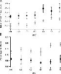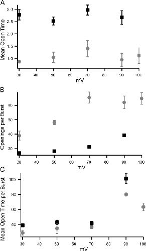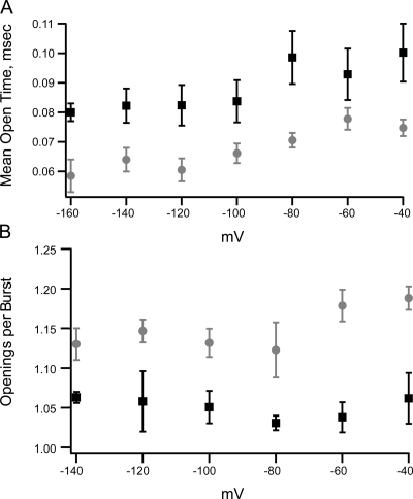 Figure 12. (A) Mean open time (overestimate) from patches containing multiple channels. Symbols are the average ± SEM of mean open durations from patches with symmetrical potassium (black squares, n = 10) or internal potassium and external thallium (gray circles, n = 9). (B) Average number of openings per burst recorded at very low PO for currents recorded with potassium (black squares, n = 10) and symmetrical thallium (gray circles, n = 11).