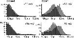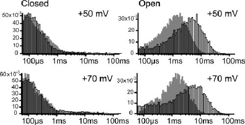 Figure 13. Duration histograms from one patch with either internal potassium (black bars) or internal thallium (gray bars) solutions. Potassium solutions were in the pipette.