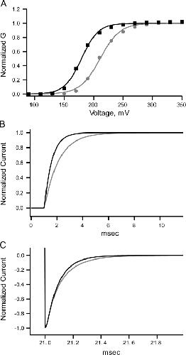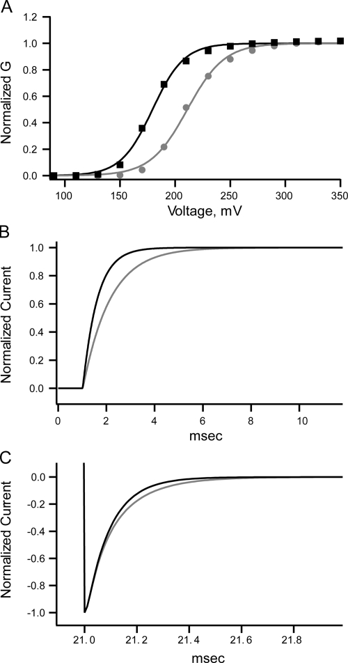 Figure 15. Simulated data with Scheme 3. (A) GV curves calculated from currents simulated with Scheme 3 with parameters that can account for permeating potassium (black trace) and permeating thallium (gray trace). The kinetic effects of permeating thallium can be mimicked by enhancing the exit rates from the open state. All of the other rate constants are constrained by the model. (B) Simulated currents for permeating potassium (black trace) and thallium (gray traces) reveal that the activation rate is altered by an increase in the rate from going to the open state to the flicker state. (C) Similarly, deactivation rates are decreased by the increase in the open to flicker rate in simulated currents for permeating potassium (black trace) and thallium (gray trace).