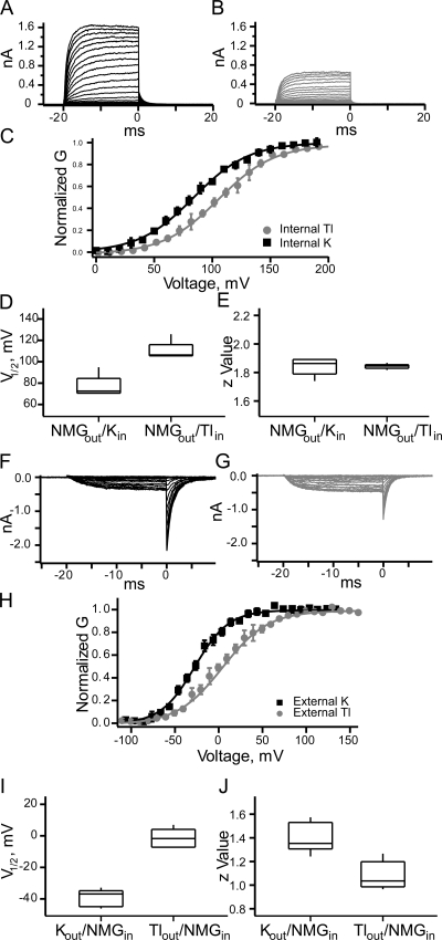 Figure 4. Gating effect from internal permeant ions. (A) Currents from an inside-out patch with external NMG and internal potassium. (B) Currents from an inside-out patch with external NMG and internal thallium. (C) The GV curves from multiple experiments. (D) Box plots of the V1/2 from Boltzmann fits of all the data with external NMG. (E) Box plots of the z values from Boltzmann fits (n = 6 for potassium and n = 5 for thallium). (F) Currents from an inside-out patch with internal NMG and external potassium. (G) Currents from an inside-out patch with internal NMG and external thallium. (H) The GV from multiple experiments. (I) Box plots of the V1/2 from Boltzmann fits of all the data with external NMG. (J) Box plots of the z values from Boltzmann fits. (n = 11 for potassium and n = 13 for thallium).