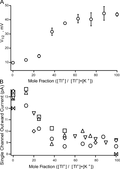 Figure 5. The shift in the GV curve as internal potassium is replaced by thallium. (A) V1/2 from Boltzmann curve fits plotted as a function of the concentration of internal thallium. (B) The single channel current at 70 mV as a function of the concentration of internal thallium. The different symbols represent data recorded from different patches. All patches were recorded in external potassium and 50 μM internal calcium. The osmolarity is balanced by potassium.