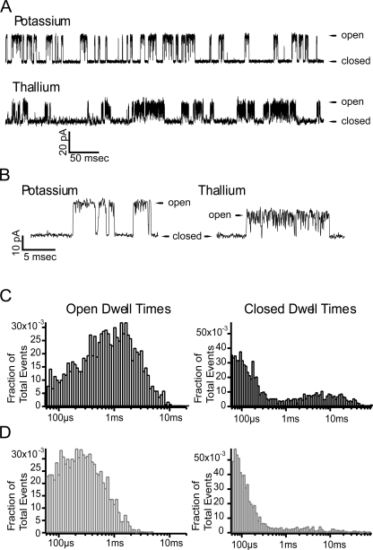 Figure 9. Single channels currents from the same inside-out patch. (A and B) The external solution (pipette) contained 100 mM NMG and the internal solution (bath) contained either 100 mM potassium or 105 mM thallium. This data was recorded at +150 mV with 0 μM internal calcium. (C and D) Open and closed dwell time histograms from the same patch shown in A and B. Black bins are from currents measured with internal potassium and gray bins are from currents measured with internal thallium.