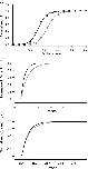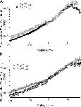 Figure 7. Simultaneous fits of GV curves with the allosteric model of Scheme 1. The top graph has data from three different calcium concentrations in symmetrical potassium solutions. The solid lines are fits with the 70-state model. All the calcium concentrations were simultaneously fit. The lower graph has data from the same patch in the top panel, except with internal thallium and three concentrations of calcium. The solid curves are fit with the Scheme 1.