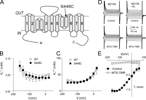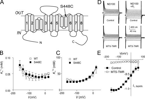 Figure 1. Topology model and basic characterization of the S448C mutant. (A) Topology model predicting eight transmembrane segment and two reentrant loops, which dip into the membrane. N and C termini are intracellular. The site of the Ser-448-Cys mutation is indicated. (B) Voltage dependency of apparent affinity constant for Pi interaction ( at −100 mV (n = 4).