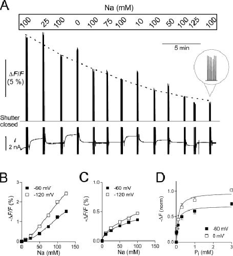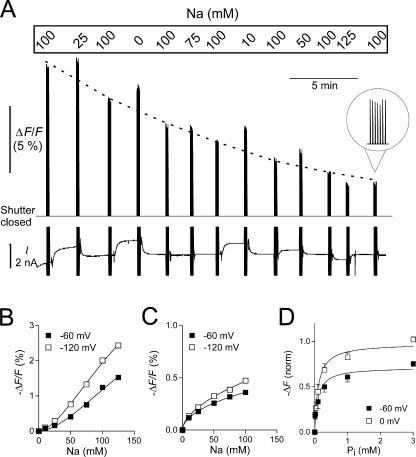 Figure 3. Steady-state fluorescence measurements. (A) Original trace showing the fluorescence signal F and the holding current I recorded on the Minidigi 1A from an experiment in which the Na+ concentration was varied. The S448C-expressing and MTS-TMR–labeled oocyte was initially clamped at −60 mV and superfused with ND100 solution. After we equilibrated the oocyte with a new test solution, the shutter was opened periodically for seven successive 230-ms pulses followed by a 2-s closing time. To control for fluorescence rundown, each test solution was bracketed by ND100 solution. For better visualization of the rundown, the ND100 data is connected by a dotted line (drawn by eye). During the shutter opening, the membrane potential was stepped from −60 to −120 mV. These step changes in membrane potential are the cause of the capacitive current spikes visible in the current recording. Note the change in holding current as the Na+ concentration is changed. When the shutter is closed, F is outside the measurable range. (B) ΔF/F plotted as a function of Na+ for a representative oocyte, after correction for fluorescence rundown. Continuous lines are fits to data using the Hill equation. (C) ΔF/F plotted as a function of Li+ for a representative oocyte using a similar protocol as in A but with variable Li+ instead of Na+. Data were fitted with the Hill equation with H constrained to 1. (D) ΔF/F plotted as a function of Pi with Na+ constant at 100 mM. During the shutter opening time, the membrane potential was stepped from −60 to 0 mV. Data for individual oocytes were fit with the Hill equation (Eq. 1) with H constrained to 1, normalized to ΔFmax at 0 mV, pooled, and refit with Eq. 1 (n = 5). See text for all fit parameters.