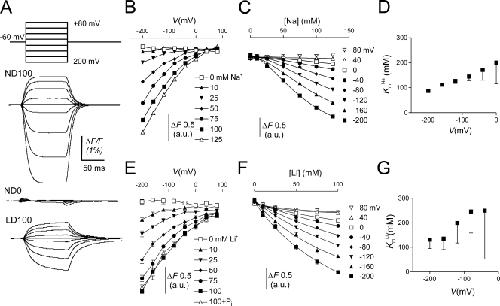 Figure 4. Cation dependency of the voltage-dependent fluorescence in oocytes expressing S448C. (A) Original fluorescence trace recorded in ND100 (top), ND0 (middle), and LD100 (bottom) solutions from an oocyte labeled with MTS-TMR. The membrane voltage was stepped from Vh = −60 mV to voltages ranging between −200 and +80 mV in 40-mV increments as indicated. ΔF signals were lowpass filtered at 70 Hz (note that in these traces the relaxations are significantly distorted by the filter). (B) Na+ dependency of the voltage-dependent fluorescence (ΔF). Steady-state fluorescence at different membrane potentials was acquired for each Na+ concentration indicated on the figure. Data points are joined for visualization only. (C) Data in B were replotted as a function of the Na+ concentration and fitted with Eq. 4 (solid lines). (D) KmNa as reported by the fit of Eq. 4 to the data in C. For the initial fit we obtained H = 1.8 ± 0.02, and then refit the data with H constrained to 1.8 to reduce the fitting error associated with KmNa. (E) Li+ dependency of the voltage-dependent fluorescence (ΔF). Steady-state fluorescence at different membrane potentials was acquired for each Li+ concentration indicated in the figure. In addition, data were acquired with 1 mM Pi in 100 mM Li+. Symbols are joined for visualization only. (F) Data in E were replotted as a function of the Li+ concentration and fitted with Eq. 4 (solid lines). (G) KmLi as reported by the fit of Eq. 4 (H constrained to 1) to the data in F.