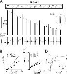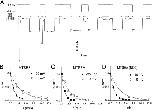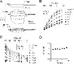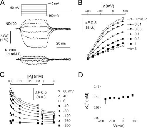 Figure 5. Pi dependency of the voltage-dependent fluorescence in oocytes expressing S448C. (A) Original fluorescence trace recorded in ND100 (top) and ND100 + 1 mM Pi (bottom) solutions from an oocyte labeled with MTS-TMR. The membrane voltage was stepped from Vh = −60 mV to voltages in the range −200 to +80 mV in 40-mV increments, as indicated. Data were lowpass filtered at 500 Hz. (B) Pi dependency of the voltage-dependent fluorescence (ΔF). Steady-state fluorescence at different membrane potentials was acquired for each Pi concentration indicated in the figure. Data points are joined for visualization only. (C) Data in B were replotted as a function of the Pi concentration and fitted with Eq. 4 (solid lines). (D) , as reported by the fit of Eq. 4 to the data in C (H constrained to 1).
