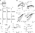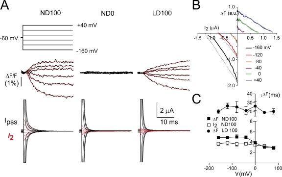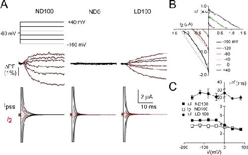 Figure 7. Presteady-state charge movements and fluorescence. (A) Simultaneous recordings of percent change in fluorescence (ΔF/F) for a representative oocyte in response to the voltage step protocol as shown, for superfusion in full Na+ (ND100), choline replacement (ND0), and Li+ replacement (LD100) and corresponding presteady-state currents (Ipss, black traces). For Ipss, the records were fit with a double decaying exponential and the main component (I2, assumed to be S448C-related is shown superimposed, red traces). For the ΔF/F records, the data were fit with a single growing exponential, shown superimposed on each trace (red traces). Recording bandwidth was 500 Hz for Ipss and ΔF/F. Baseline adjustment was performed for Ipss. (B) Parametric plot of ΔF/F against I2 as a function of time for the cell in A at the indicated test potentials. Dotted lines indicate deviations from linear behavior for hyperpolarizing potentials. (C) Voltage dependency of the time constants associated with the decay of I2 (ND100) and time-dependent phase of ΔF/F (ND100, LD100). Note that the ordinate scale covers two ranges. Data pooled from n = 5 cells.