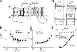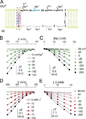 Figure 8. Modeling the transport cycle of NaPi-II. (A) Kinetic scheme for the transport cycle of NaPi-II. Transitions that are influenced by voltage are indicated by blue arrows and include transition of the empty carrier (1⇔8) and the second Na+ binding (2a⇔2b). No information is available on the internal substrate interaction transitions, but they are depicted to mirror those taking place on the external side and are indicated with gray arrows. The highest fluorescence is associated with states 1 and 8, and is highlighted with a red box. (B) Simulated ΔF in response to membrane voltage and Na+ concentration. The points are joined for visualization only. (C) Data in B were replotted as a function of [Na]. The solid lines represent the fit Eq. 4. The Hill coefficient reported by the fit was 1.8 ± 0.01, in excellent agreement with experimental data. (D) Simulated ΔF in response to membrane voltage and Li+ concentration (data points joined for visualization only). Based on experimental data, we assumed that Li+ only interacts with the first Na+ binding step (1-2a). (E) Data in D were replotted as a function of [Li] and fitted with Eq. 4. The Hill coefficient reported by the fit was 1.0. The rate constants (in s−1) used in the simulations were as follows: k12a = 500[Na]o or k12a = 200[Li]o, k2a1 = 900(Na+ data) or k2a1 = 40 (Li+ data), k2a2b = 10,000[Na]oexp(αeV/2kT), k2b2a = 200exp(−αeV/2kT), k81 = 40exp(−γeV/2kT), k18 = 400exp(γeV/2kT). α and γ are the fractions of the electrical field that are sensed by the hypothetical charge moving through the membrane electrical field for transitions 2a⇔2b and 1⇔8, respectively, and were set to α = 0.13 and γ = 0.4. We assumed sharp, symmetrical energy barriers for the voltage-dependent transitions. Differential equations describing the rate of change of state occupancies (Xn) were solved for the state occupancies, where n is the state. The state occupancies were constrained such that X8 + X1 + X2a + X2b = 1, and the change in fluorescence was given by ΔF = 1 − (X2a + X2b). For the simulations, T = 293 K, [Na]o varied from 0 to 0.125 M, [Li]o varied from 0 to 0.1 M.