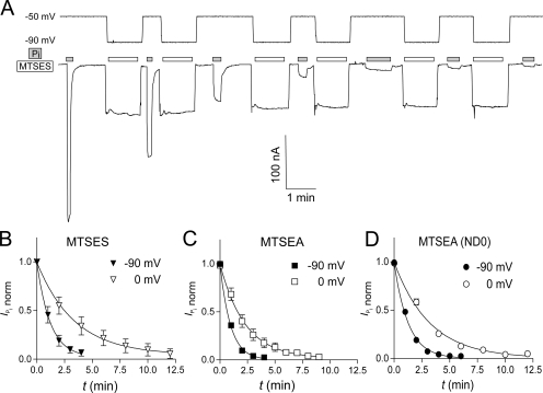 Figure 2. Time course of modification of Cys-448 by MTS reagents. (A) Original voltage (top) and current (bottom) trace acquired from an oocyte expressing S448C and repeatedly exposed to 25 μM MTSEA for successive 1-min intervals (white bars). During MTSES exposure, the membrane potential was held at −90 mV. After washout of MTSES, the membrane potential was changed to −50 mV and 1 mM Pi was applied (gray bars) to record the Pi-induced current. (B–D) at t = 0 and fitted with Eq. 3 (solid line) to obtain the effective second-order rate constant (see Table I).