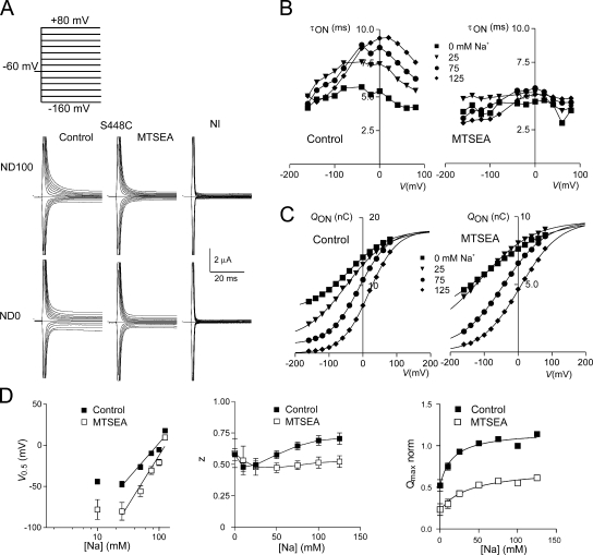 Figure 6. Presteady-state charge movements associated with S448C before and after labeling. (A) Representative current recordings from the same oocyte before (left) and after (middle) labeling with 1 mM MTSEA for 3 min for superfusion in 100 mM Na+ (ND100) and 0 mM Na+ (ND0). Voltage steps were applied from Vh = −60 mV to test potentials in the range −160 to +80 mV, as indicated. For comparison, currents from a noninjected oocyte (NI, right) from the same donor frog are also shown for the two superfusion conditions. (B) Voltage dependency of the main relaxation time constant (τON) as a function of the four Na+ concentrations indicated, before (left) and after (right) labeling for the S448C expressing oocyte in A. (C) Corresponding voltage dependency of the ON-charge (QON) associated with the main relaxation component plotted for four Na+ concentrations indicated before (left) and after (right) labeling. Continuous lines are fits with Eq. 2. The data were offset so that each curve superimposed at the depolarizing limit predicted for ND125, to better visualize the effect of Na+ on V0.5. Note the difference in ordinate scales for the control and +MTSEA conditions. (D) Summary of the Na+ dependency of the Boltzmann fit parameters, V0.5 (left), z (middle), and normalized Qmax (right). Data points are shown as mean ± SEM (n = 4). The linear regression lines for the V0.5 data were fit to data points for Na+ ≥ 25 mM. The Qmax data were fit the modified Hill equation (Eq. 1) with a variable offset and H constrained to 1, and yielded KmNa = 16 ± 6 mM for control and 38 ± 14 mM for +MTSEA. For z, data points are joined for visualization only.