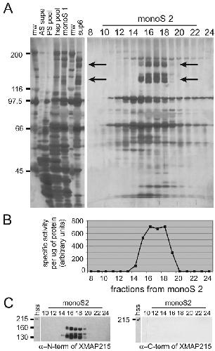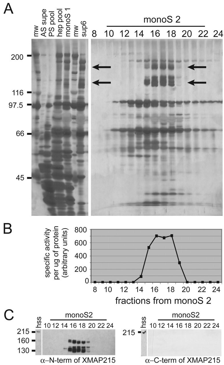 Figure 2. Proteins of 130 and 160 kD were enriched during the purification and consistently copeaked with activity. (A) Specific activity increased with each step of the purification, as did the prominence of p160 and p130 bands (arrows). Shown here is a silver-stained polyacrylamide gel containing fractions from the purification. Samples for the first seven lanes are listed as follows: mw, molecular weight markers; AS supe, 40% AS supernatant (5 μg protein; 4 U of specific activity); PS pool, phenyl sepharose pool of active fractions (4 μg; 10 U); hep pool, heparin pool (4.8 μg; 300 U); monoS 1, first monoS column (5 μg; 600 U); sup6, gel filtration/superose 6 (2.5 μg; 600 U). The remaining lanes (monoS2) represent fractions from the second monoS column; depolymerizing activity peaked in fractions 16, 17, and 18 (see B). Lanes loaded with these fractions each contain ∼1.3 μg of total protein and 1,260 U of specific activity. Arrows indicate p130 and p160 bands. Identity of the p130 bands (lower arrows) from these fractions was determined by mass spectrometry. (B) Activity profile for fractions for the monoS2 step. Relative activity was estimated for fractions 8–24 by serial titration in the depolymerization assay and is presented in this graph as arbitrary units per microgram protein. (C) p160 and p130 bands are NH2-terminal fragments of XMAP215. Western blots of high-speed supernatant (hss) and monoS2 fractions were probed for XMAP215 with NH2-terminal– or COOH-terminal–specific antibodies.