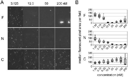 Figure 4. Pure recombinant XMAP215 depolymerizes CPP MTs in vitro. (A) Full-length XMAP215 and an NH2-terminal fragment of XMAP215 both depolymerize CPP MTs, but a COOH-terminal fragment does not. Rhodamine-labeled CPP MTs were incubated for 15 min in buffer containing different concentrations of full-length XMAP215 (F), an NH2-terminal fragment (N), or a COOH-terminal fragment (C). Shown here are representative fluorescence images for four concentrations of each protein. Bar, 10 μm. (B) Full-length XMAP215 and the NH2-terminal fragment have depolymerizing activity between 6.25 and 200 nM. MT polymer was quantitated for each sample by calculating average fluorescent pixel area per field for each protein concentration of full-length (F), NH2-terminal (N), and COOH-terminal (C) XMAP215. MT polymer is expressed as percent median value of buffer control; error bars denote 10th and 90th percentile; the 75th, 50th, and 25th percentiles are represented by the top, middle, and bottom of each box.