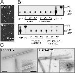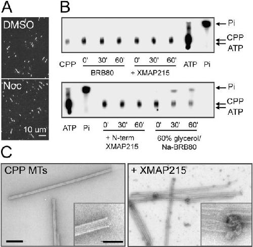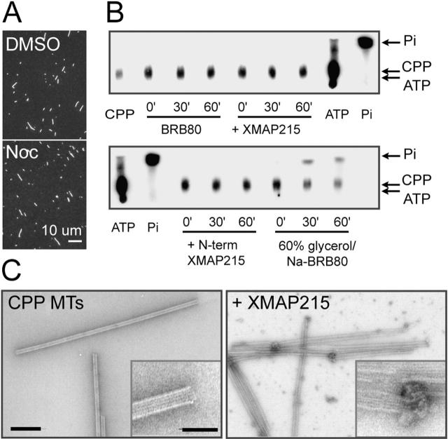 Figure 6. Mechanism of CPP MT depolymerization by XMAP215. (A) Nocodazole does not depolymerize CPP MTs in our assay. Dimer sequestration was tested by incubating rhodamine-labeled CPP MTs with buffer plus DMSO or 20 μM nocodazole. (B) XMAP215 does not accelerate hydrolysis of GMPCPP. TLC was used to detect the hydrolysis of γ-32P–labeled GMPCPP in CPP MTs treated with buffer alone, full-length XMAP215, NH2-terminal fragment of XMAP215, or Na-BRB80/60% glycerol (positive control). Time points were taken from each reaction at 0, 30, and 60 min. [γ-32P]GMPCPP (CPP), [γ-32P]ATP (ATP), and 32Pi (Pi) are loaded as markers. Release of Pi is seen by the appearance of a second spot in Na-BRB80/60% glycerol, but not in XMAP215 or NH2-terminal XMAP215 samples. Microscopy assays run in parallel demonstrated that treatment with XMAP215 and the NH2-terminal construct depolymerized CPP MTs by the final time point (not depicted). (C) XMAP215 causes protofilament curling on MT ends. CPP MTs were incubated in buffer alone or buffer plus 38.5 nM full-length XMAP215 for 2 min and imaged by negative stain EM. Bars: (left) 200 nm; (right) 50 nm.
