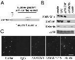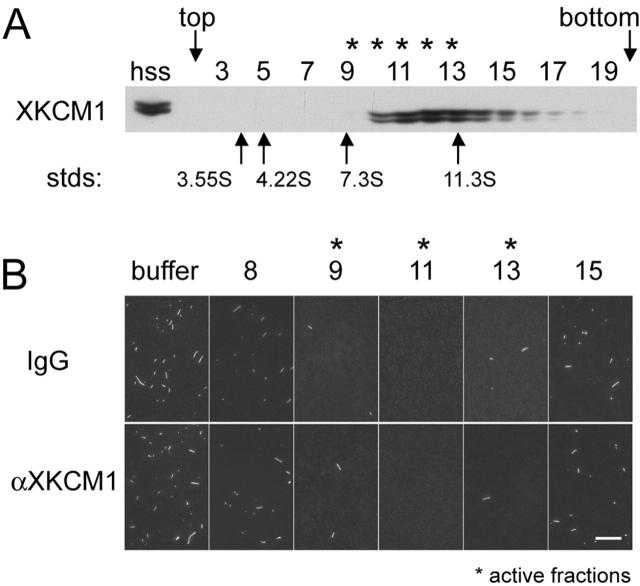 Figure 1. There is a CPP MT–depolymerizing activity in Xenopus egg extract independent of XKCM1. (A) XKCM1 overlaps with the peak of depolymerizing activity on sucrose gradients. 50 μl of clarified CSF extract was sedimented over a 5–20% sucrose gradient. Western blot of fractions showed that XKCM1 is present in fractions 10–18. CPP MT–depolymerizing activity peaked in fractions 9–14 (see B). Arrows below the blot indicate sedimentation values for protein standards run on a parallel gradient. Active fractions are labeled with asterisks. (B) Inhibition of XKCM1 did not inhibit depolymerizing activity in sucrose gradient fractions. Fractions from the sucrose gradient shown in A were assayed for depolymerizing activity, using rhodamine-labeled CPP MTs as described in the Materials and methods. Each fraction was assayed in the absence of ATP and in the presence of random IgG or inhibitory amounts of α-XKCM1 antibody and fixed after 10 min. XKCM1 depolymerizing activity is ATP dependent. As shown, neither the absence of ATP nor the presence of αXKCM1 antibody blocked the depolymerizing activity of active fractions. Active fractions are labeled with asterisks. Bar, 10 μm.