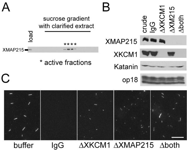 Figure 3. XMAP215 contributes to CPP MT–depolymerizing activity in CSF extract. (A) Full-length XMAP215 copeaks with depolymerizing activity on a sucrose gradient. Sucrose gradient fractions were analyzed by Western blot with COOH-terminal–specific α-XMAP215 antibody. Active fractions are labeled with asterisks. (B) Crude extract was specifically depleted of full-length XMAP215, XKCM1, or both. Samples were depleted with random IgG, COOH-terminal α-XMAP215 antibody (ΔXMAP215), α-XKCM1 antibody (ΔXKCM1), or both α-XMAP215 and α-XKCM1 antibodies (Δboth). Western blots for the four major depolymerizers (XMAP215, XKCM1, katanin, and Op18) are shown for each condition. (C) Depletion of XMAP215 and XKCM1 from crude extract inhibited CPP MT depolymerization. Rhodamine-labeled CPP MTs were incubated in depleted extracts for 10 min. Representative fluorescence images of each sample are shown. Buffer used for negative control was CSF-XB (extract buffer used, see Materials and methods). Bar, 10 μm.