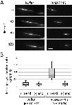 Figure 5. XMAP215 promotes CPP MT depolymerization at MT plus ends. (A) XMAP215 promotes end-dependent CPP MT depolymerization. Shown here are images from a time-lapse series of dim-bright CPP MTs (see Materials and methods) treated with buffer alone or buffer plus 19 nM XMAP215 (interval between still images is 40 s). In each sample, kinesin motility was used to determine MT polarity; translocation of the MT from left to right represents minus end leading and plus end lagging. In the XMAP215-treated sample, the plus end shortens while the minus end remains stable (see Video 1, available at http://www.jcb.org/cgi/content/full/jcb.200211095/DC1). (B) Depolymerization by XMAP215 is specific to MT plus ends. Depolymerization rates were quantitated for each MT end from experiments as in A. Error bars denote 10th and 90th percentile; 75th, 50th, and 25th percentiles are represented by the top, middle, and bottom of each box.