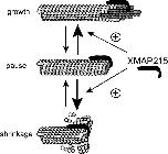 Figure 7. Model for the potential mechanism of XMAP215 as an antipause factor. Depicted here are the growing MT end (top) as a sheet-like structure of protofilament extensions and the shrinking MT end (bottom) with curled protofilaments (adapted from Miyamoto et al., 2002). The hypothetical paused MT end structure (middle) is positioned as an obligate intermediate between the two, drawn here with a blunt-ended, closed tube structure. We propose that XMAP215 destabilizes this pause state by weakening interprotofilament bonds and/or preventing tube closure, increasing transition to either the growing or shrinking state (arrows). Based on work by Cassimeris et al. (2001), we depict XMAP215 here as a long curved molecule that can bind protofilaments along their long axis.