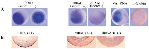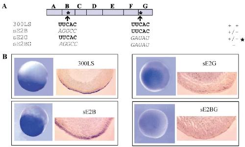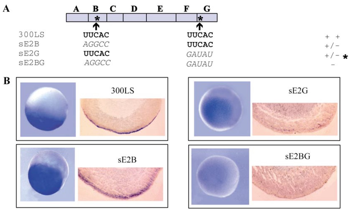 CUUUU. The E2 sites are UUCAC, UUGCAC, AUCAC, UUCAU, UCCAC, or UUCAG. (A) Comparison of the VegT and Vg1 LS. E2 sites