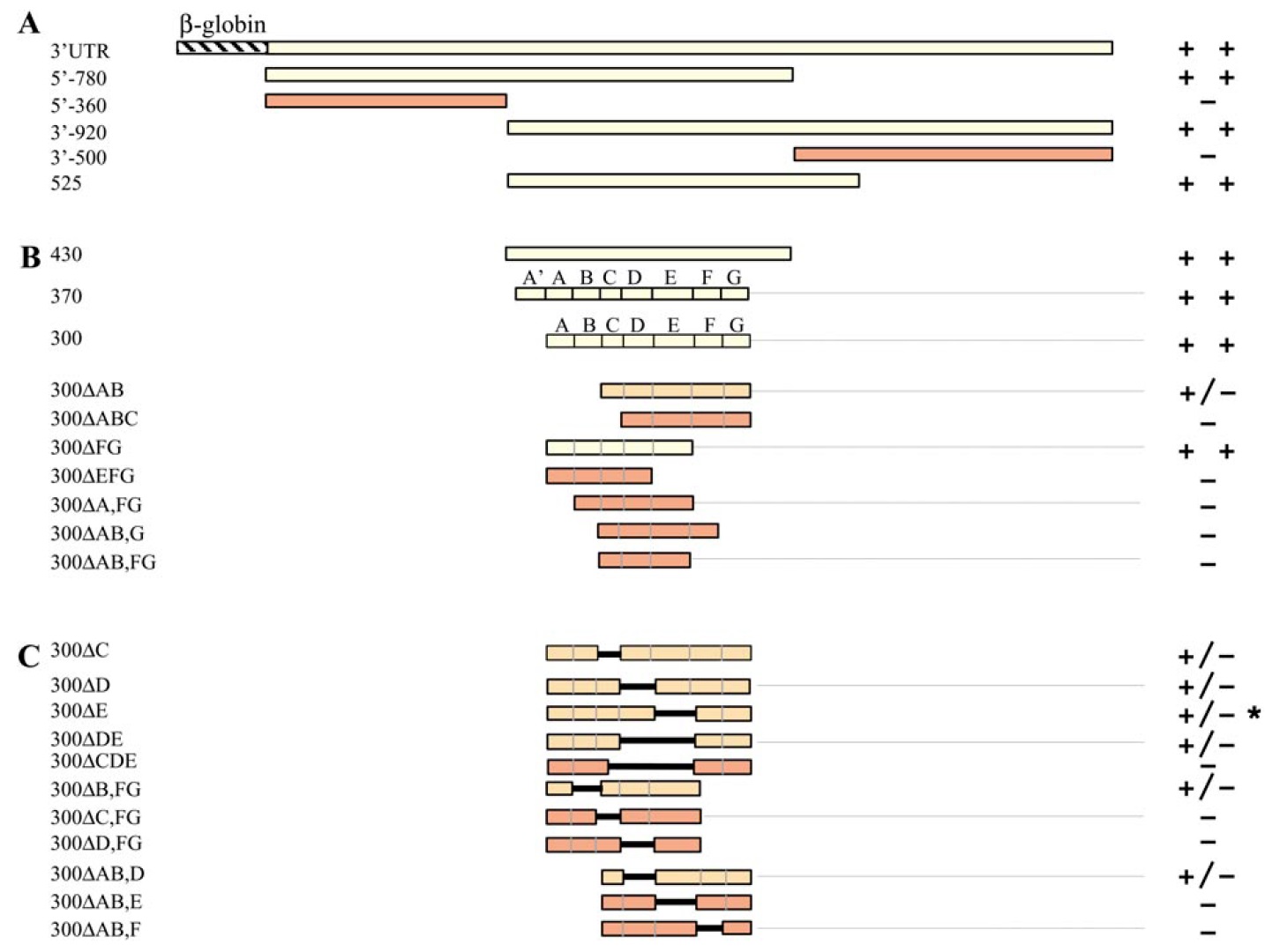 and position in the 3 UTR. (B) Defining the borders of VegT LS. Deletions in the 370-nt LS are named from A to G, where A includes the