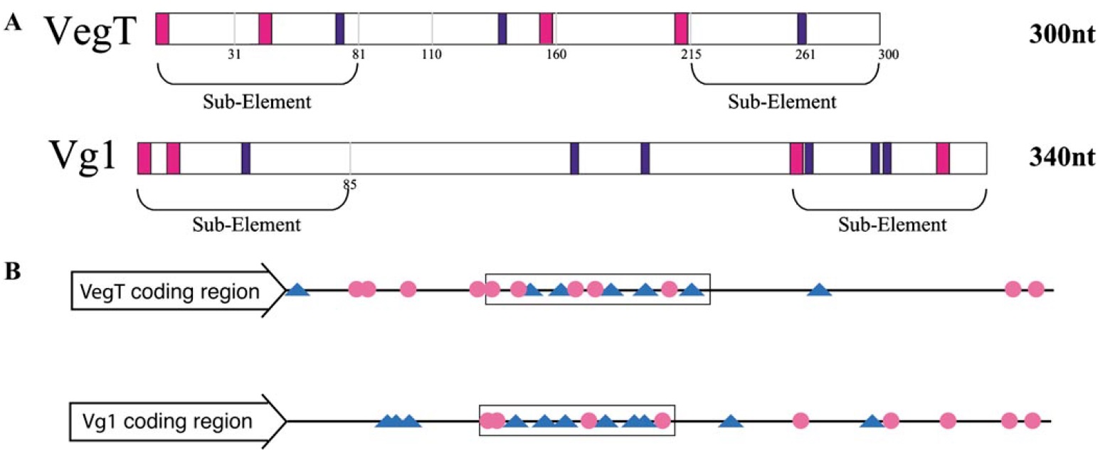within the 3 UTRs of VegT and Vg1 RNAs. The E2 sites are depicted as blue triangles, the VM1 sites are shown as red circles, and the VegT
