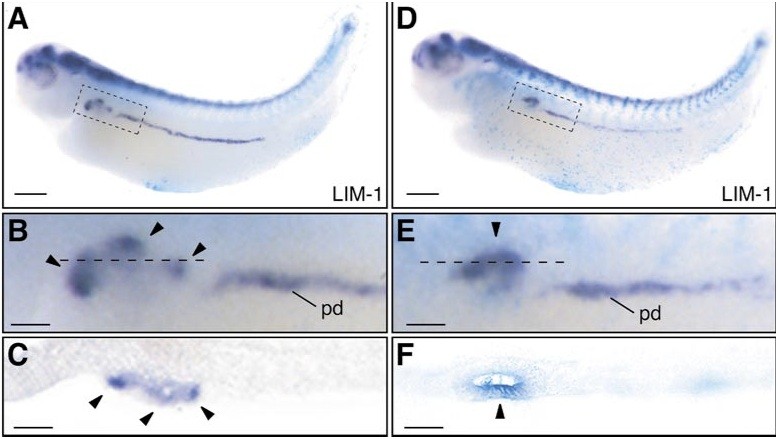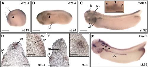 FIG. 1. Wnt-4 is expressed in the pronephric anlage and pronephric tubules. Wnt-4 transcripts were detected by whole-mount in situ hybridization. (A, F) Lateral views of Xenopus embryos with anterior to the left. (A) Wnt-4 expression in the pronephric anlage (arrowhead) of a stage 19 embryo. Expression is also present in the brain (b) and neural tube (nt). (B) At stage 24, Wnt-4 expression is prominently detected in the pronephric tubule anlage (arrowhead) and the ventralblood islands (bi). (C) At stage 32, Wnt-4 expression was associated with the pronephric tubules. Inset shows an enlargement of the pronephros with the three nephrostomes (arrowheads). Other regions with Wnt-4 expression include visceral arches (va), the neural tube, and discrete sections of the mid- and hindbrain (mb, hb). (D, E) Sections of stage 24 (D) and 32 (E) embryos hybridized in whole mount with Wnt-4 antisense probes. Embryos were embedded in agarose and transverse sections (30 ï°m) were cut at the level of the developing pronephric kidney. Sections are oriented with dorsal to the top. (D) Wnt-4 expression was detected in the pronephric anlage (pa) and neural tube (nt). The inset shows an enlargement of Wnt-4 expression in the somatic layer (so) of the intermediate mesoderm. The splanchnic layer (sp) and endoderm (ed) are devoid of any expression. (E) Wnt-4 expression is associated with the developing pronephric tubules (pt) and the floor plate (fp). The inset shows a close-up view of Wnt-4 expression in the pronephric tubules. (F) A stage 32 embryo stained for Pax-2 expression to visualize the pronephric kidney with tubules (arrowheads) and duct (pd) is shown for comparative purposes. Scale bars: 600 ï°m (A, B, C, F); 200 ï°m (inset in C); 140 ï°m (D, E); 40 ï°m (insets in D, E).