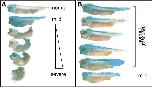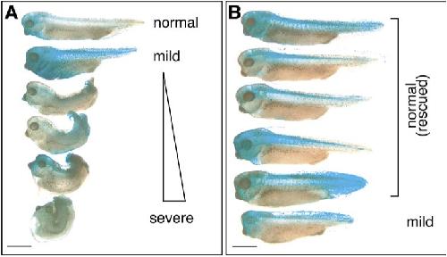 FIG. 4. In vivo suppression of the Wnt-4 overexpression phenotype by Wnt-4 antisense morpholinos. Both blastomeres at the two-cell stage were injected with either 0.25 ng Wnt-4 mRNA alone or Wnt-4 mRNA and Wnt4-MO (0.25 ng each). RNA encoding cytoplasmic -galactosidase mRNA (cytgal) was coinjected as a lineage tracer. Embryos were fixed at stage 33/34, processed for gal activity, and classified according to their phenotype. (A) Injection of Wnt-4 mRNA frequently causes a shortened body-axis phenotype. In the experiment shown, 31% (n 25) of the embryos were normal or mildly affected. Moderate phenotypes were observed in 64% (n 52) and severe truncations were found with 5% (n 4) of the embryos. Examples of embryos with phenotypes ranging from mild to severe are shown. (B) Coinjection of Wnt4-MO rescues Wnt-4-injected embryos. Out of the injected embryos (n 41), 85% developed with no discernable phenotype. Examples of rescued embryos are shown. A mild shortened body-axis phenotype was observed with 15% of the embryos. Scale bars: 1.1 mm (A); 1 mm (B)