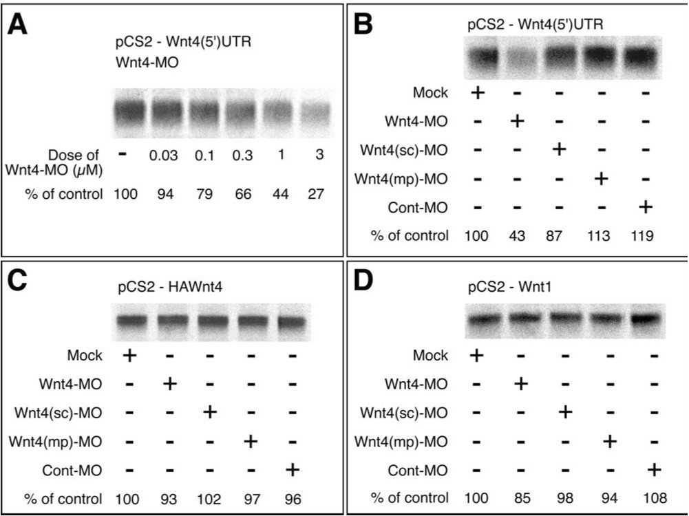 FIG. 3. Inhibition of Xenopus Wnt-4 translation in vitro by Wnt-4 antisense morpholinos. Plasmids (50 ng) encoding Wnt-4, HAWnt-4, and Wnt-1 were used as templates in cell-free coupled transcriptionranslation reactions. Several morpholinos [Wnt4-MO; sense control, Wnt4(sc)-MO; four-mispaired control, Wnt4(mp)-MO; and a standard control, Cont-MO] were tested for inhibition of translation. Cell-free transcriptionranslation reactions were performed in the presence of [35S]methionine and analyzed by SDSAGE/autoradiography. (A) Dose-response analysis of inhibition of Wnt-4 translation by Wnt4-MO. The amount of radiolabeled protein produced was quantified by using a phosphorimager. The control sample, which was not treated with Wnt4-MO, was set at 100%. Significant reduction of protein synthesis occurred with 1 and 3 M Wnt4-MO. (B) Sequence-specific inhibition of Wnt-4 translation by Wnt4-MO. Morpholinos (1 M) were used to inhibit translation of Wnt-4. Only Wnt4-MO was effective in blocking Wnt4 translation. (C, D) In vitro translation of HAWnt4 (an HA-tagged Wnt-4 variant lacking the complementary target sequence for Wnt4-MO) and Xenopus Wnt-1 was essentially unperturbed in the presence of Wnt4-MO. Morpholinos were used at 1 uM.