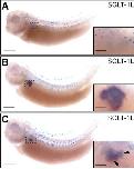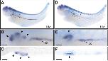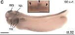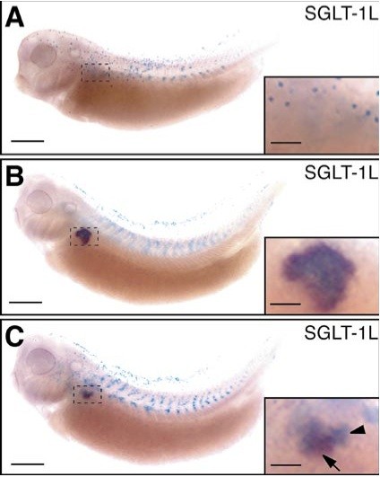Fig. 6. Coinjection of HAWnt-4 rescues SGLT-1L expression in Wnt4-MO-treated Xenopus embryos. Single V2 blastomeres of eight-cell stage embryos were injected with 5 ng Wnt4-MO alone (A) or in conjunction with 0.25 ng HAWnt-4 mRNA (B, C). Cytoplasmic beta-galactosidase mRNA (cytBgal; 0.1 ng) was coinjected as a lineage tracer. Tailbud embryos (stage 33/34) were processed for Beta-gal activity and hybridized with antisense SGLT-1L probes. (A) Injection of 5 ng Wnt4-MO abolishes pronephric expression of SGLT-1L. The enlargement of the pronephric tubule region shows the presence of Beta-gal-expressing cells (pale blue), but absence of SGLT-1L transcripts. (B) Control side of an embryo coinjected with Wnt4-MO and HAWnt-4 mRNA. The inset illustrates normal SGLT-1L expression in the pronephros. (C) Injected side of the embryo shown in (B). The enlargement of the bordered area reveals substantial expression of SGLT-1L in the pronephros. Note that Beta-gal-expressing cells (arrowhead) are adjacent or colocalize with SGLT-1L-expressing cells (arrow). Scale bars: 600 um (A); 120 um (insets).