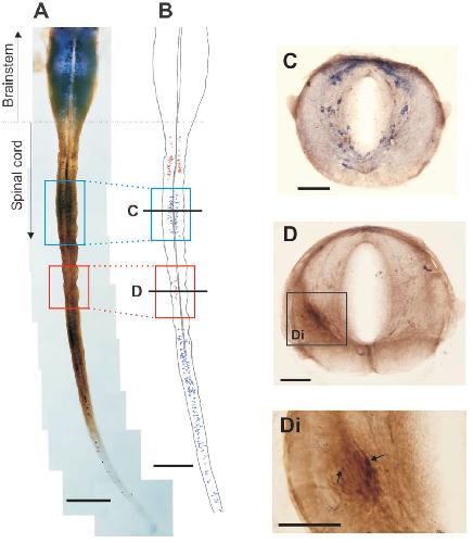 (D) Cross sections from spinal cord where labelled motoneurons were located in wholemount preparations. (Di) Higher magnification shows labelled motoneurons